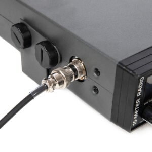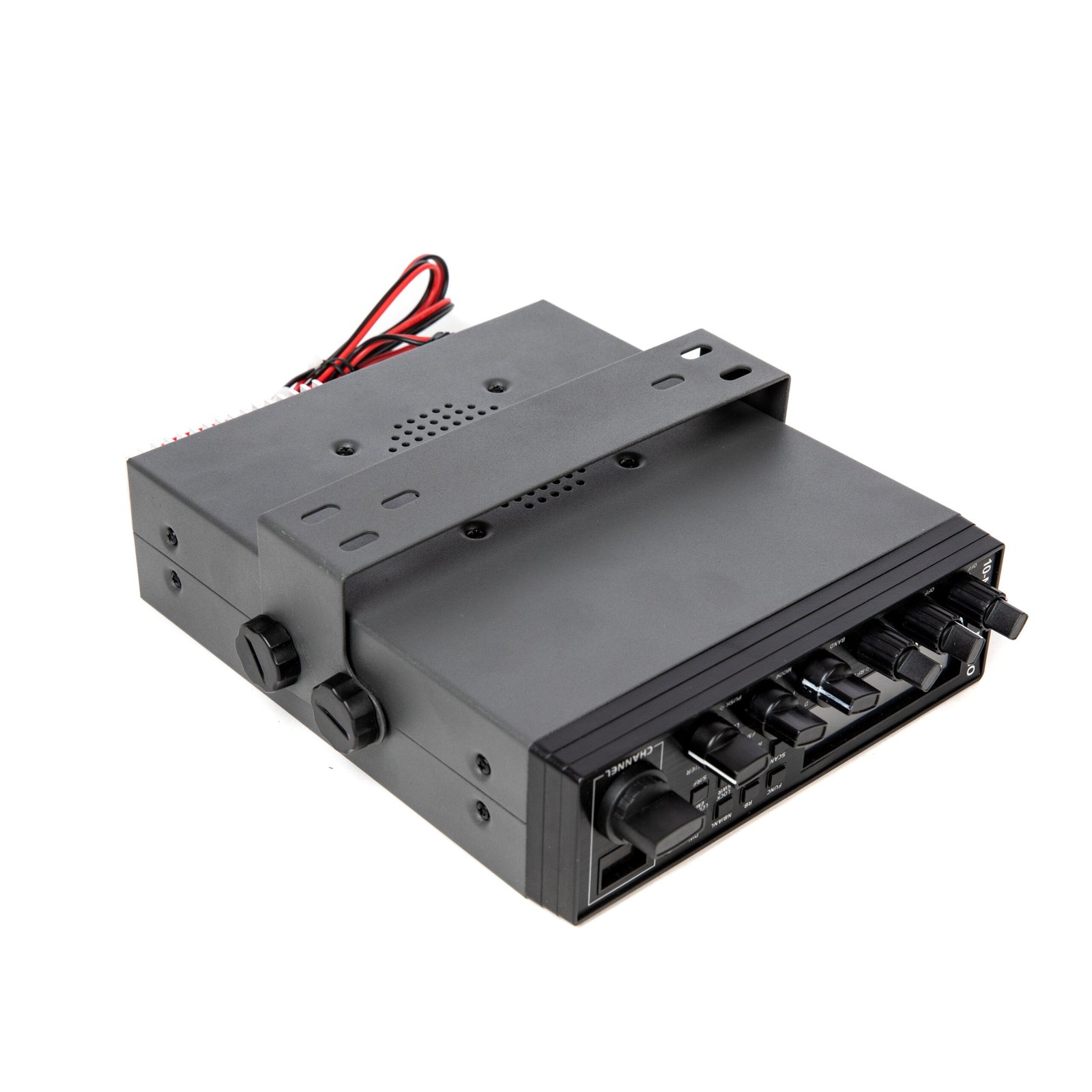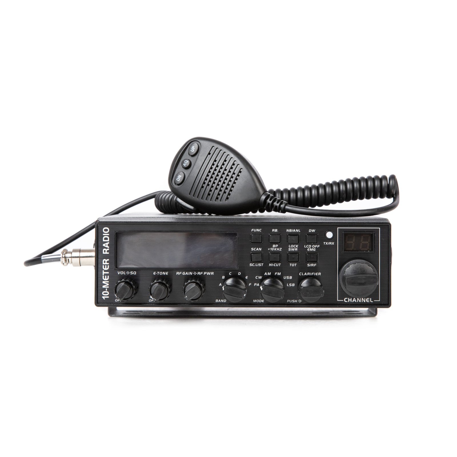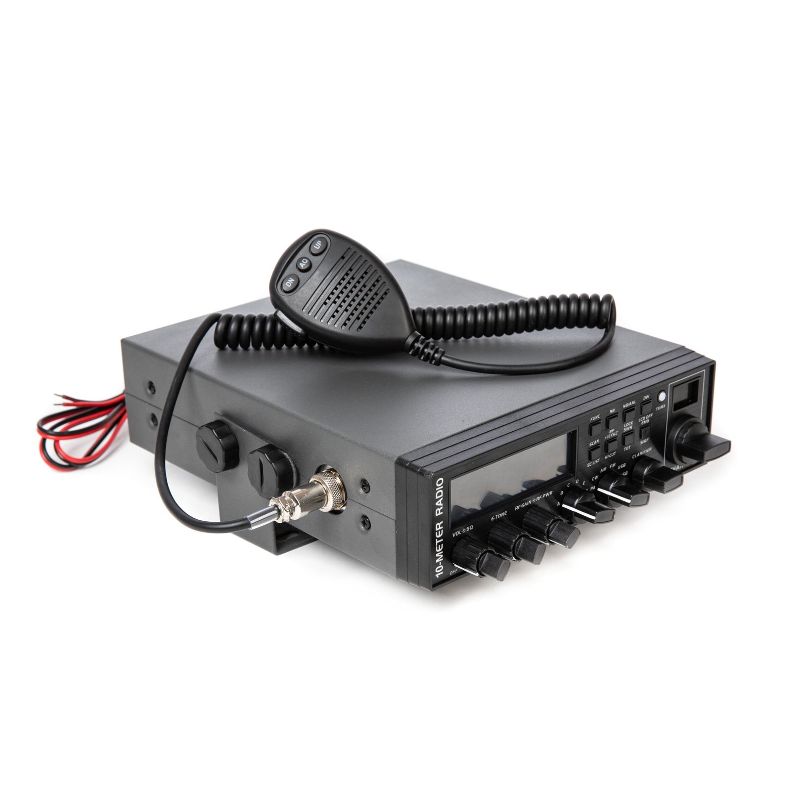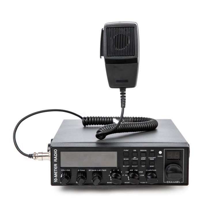 The radio comes with a plug-in dynamic microphone that has a push-to-talk switch and coiled cord for easy use. It includes adjustable squelch and an automatic noise blanker to reduce background noise.